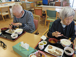 炭の香ばしい香りがフロアに広がる中、ご利用者様からは「いい匂いだね。」「今日はいつもよりいっぱい食べれちゃう!」と笑顔で食事を楽しまれていました。また、お吸い物の具を入れるお手伝いをしてくださった方もおり、皆様で協力しながら温かい雰囲気に包まれた昼食となりました。秋の始まりを感じる、美味しく心温まるひとときでした。