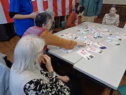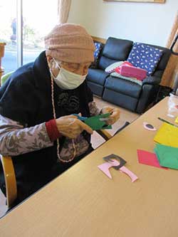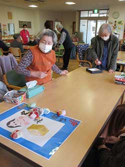 「目と鼻と口にあるものは出さなきゃいけないんだよ。昔は家で飾ってたのよ」と仰られ、家で暮らしていた時のことをお話聞かせて下さいました。「これは可愛いね。折り紙でもこんなかわいく作れるなんてすごいね」と壁飾りを見て笑顔を浮かべる方が大勢いらっしゃいました
