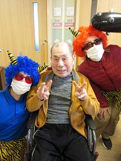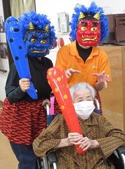 普段居室でなかなか起きられない利用者様もフロアに出られ、鬼に豆をまいて参加されていました。豆まきの後には、鬼と笑顔で記念撮影されました。皆様喜ばれていたので来年も開催をしたいと思います。
