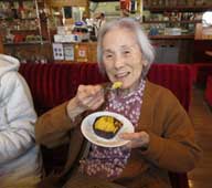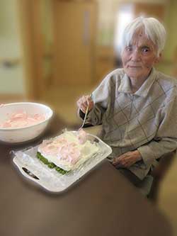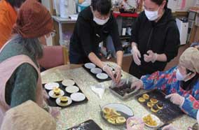 ピンクの生地にさくらあんを包み、御自分で食べやすいように巻いていただき、桜の花弁に合わせ、一足早く春の気分を感じながら召し上がられていました。「手作りのおやつは美味しくて格別だね。もっと食べたい」と言われる方もおられ、大好評でした。