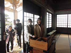 ちょうど風が強い日で寒かったのですが、しっかりお参りをして来ました。また、出かけられなかった利用者様は、残った職員とおやつレクのおしるこを作って頂きました。施設に戻った頃におしるこが出来上がり、「寒かったから余計に美味しい。」「外は寒かった?」等会話が弾みながら召し上がられました。二種類のレクを同じ日に行なう新しい試みでしたが、なかなか好評だったので、定期的に行っていきたいと思います。