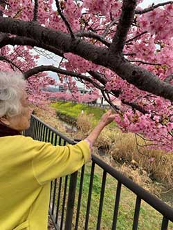 今までは苑内にて桜を持って来て見ていただいたのですが少し寂しさを感じていました。実際に現地まで行き見てもらうと利用者様から「すごいね、綺麗だね」と嬉しそうにされていました。久し振りの外出という事あり現地まで行く車の中や公園等では、苑では見られないような笑顔や会話が生まれ、外出をしてよかったなと思いました