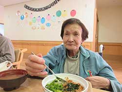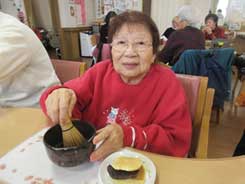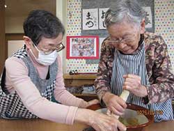 食事の準備は汁づくりから始まります。「職員さん、この味みてください。私は薄い様に思えるんだけど、もう少し出汁を足した方が良いんじゃないかなぁ。」入居者様と相談、時には教えて頂きながら食事作りは進みます。ひな祭りには伊賀饅頭作りに挑戦しました。試行錯誤し完成した伊賀饅頭を見て皆様とても満足気、ご自分で作った饅頭は格別だったようです。