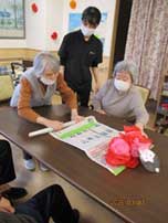 鬼の顔を工作で作り、机の上に置いて豆まきを楽しみました。豆の代わりに新聞紙を丸めた物を使用し、「鬼は外!福は内!」の掛け声とともに、皆様元気よく投げておられました。職員も鬼のお面をかぶって参加し、会場は笑い声に包まれ大いに盛り上がりました。利用者様からは「昔は家の外まで豆をまいたよ。」「地域によってやり方や投げる物が違ったね。」など懐かしい節分の思い出や地域の風習についてのお話も聞かれました。季節の行事を通して、昔を思い出しながら皆様と楽しいひとときを過ごす事ができました。