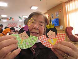 段飾りのひな人形を飾るときから皆様でにぎやかに飾っていただきました。ひなまつり会ではお内裏様になっていただき記念写真を撮らせていただきました。お化粧も自らされて笑顔あふれるひなまつり会でした。翌日には「早くお内裏様に後ろ向いてもらわんと嫁にいけんに」と言われ急いで後ろを向いてもらっている職員の姿もありました