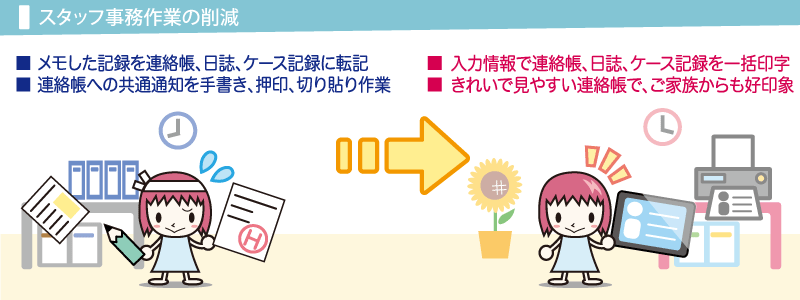 ご利用者様の情報や経過観察の情報をリアルタイムに確認できます。事務作業軽減により、ご利用者様と接する時間を増やすことでサービス向上を目指します。