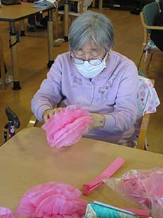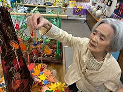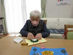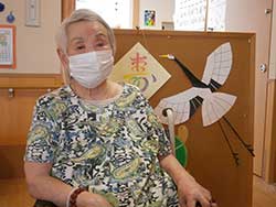 「目と鼻と口にあるものは出さなきゃいけないんだよ。昔は家で飾ってたのよ」と仰られ、家で暮らしていた時のことをお話聞かせて下さいました。「これは可愛いね。折り紙でもこんなかわいく作れるなんてすごいね」と壁飾りを見て笑顔を浮かべる方が大勢いらっしゃいました