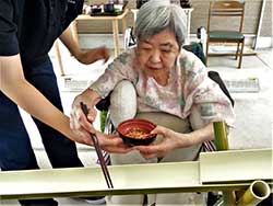 いつもはあまり食事を摂られない方や「そうめんはちょっと苦手」と言われていた方も皆様思った以上に召し上がられ、「美味しい」と喜んでいただけました。さらに水の流れが川音のようで、夏を感じることも出来たと思います。今回はネギやゴマ、生姜などで楽しみましたが、来年は更に調味料を増やして色々な味を堪能できたらと思っています