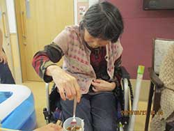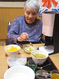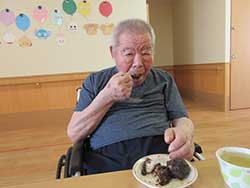 あんみつに入れる白玉作りでは利用者様によって大きさや形は色々でしたが、話す事を忘れるくらい真剣にこねていました。また「美味しくなあれ」と言いながらこねている方もいて美味しいあんみつができました。今後も一緒に楽しめるレクを計画していきたいと思います。