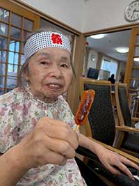 鮎を串にさす作業、塩を振る作業を利用者様が行ってくださいました。炭火でじっくり焼き上げた鮎は柔らかく、皆様串のままかぶりついていました。骨まで柔らかく、頭も召し上がれた方もいらっしゃいました。「美味しかった」「なかなか炭火焼の鮎なんて食べられないもんね」「またやってね」と皆様とても嬉しそうでした。