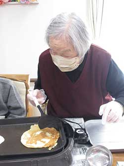 清らかな空気の中、皆様、真剣な表情で静かに手を合わせていらっしゃいました。参拝後の帰り道で「久しぶりに来れて良かった」と喜びの声が聞かれました。おやつレクでは、皆様と一緒にどら焼き作りを楽しみました。フロア内に広がる甘くて香ばしい匂いに、皆様の気分が高まりました。今回は各自で仕上げて頂くスタイルで、生地を丁寧に焼いて餡をたっぷり包みました。ご自身で作った物は格別だったようで「手作りはやっぱりおいしいね」と笑顔がこぼれていました。