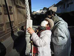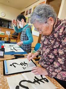 抹茶を点てる際、何人かの利用者様は「結構やってたから」と手際よく点てられており、職員にコツを教えられたりする様子も見られました。点てた後はお饅頭と一緒に召し上がり、昔の思い出などを語りながら賑やかに過ごされていました。馴染みのある神社へ初詣に出かけた際は、移動中の車内で流れていく景色を眺めながら「この道は知ってるよ」「あのお店まだある?」と思い入れのある場所を懐かしんでおられ、神社に着くと職員と共に作法を確認しながらしっかりと手を合わせ、お願い事をされていました。その後書初めも行い、お手本を確認しながら今年の干支である「うま・午」や「正月」、「もち」といった言葉を一文字ずつ丁寧に書かれていました。