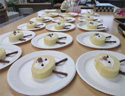 おやつ作りでは節分恵方巻ロールを作りました。ココアパウダーを混ぜたスポンジ生地にクリームを塗り、フルーツを並べ巻いていきました。「巻くのが意外と難しいね」「皆で作ると楽しいですね」と自然と会話も弾み笑顔があふれるおやつ作りになりました。これからも季節に合わせたレクリエーションやおやつ作りを企画したいと思います。