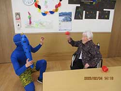 施設内に現れた鬼に利用者様と職員でボールをぶつけ鬼退治をしました。皆様元気よく「鬼は外!」と声を出して楽しまれておりました。今年もよい一年になるように、今後もさまざまなイベントを考えていきたいと思っております。。