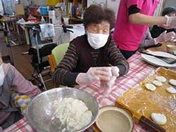 食事の準備は汁づくりから始まります。「職員さん、この味みてください。私は薄い様に思えるんだけど、もう少し出汁を足した方が良いんじゃないかなぁ。」入居者様と相談、時には教えて頂きながら食事作りは進みます。ひな祭りには伊賀饅頭作りに挑戦しました。試行錯誤し完成した伊賀饅頭を見て皆様とても満足気、ご自分で作った饅頭は格別だったようです。