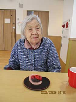 ピンクの生地にさくらあんを包み、御自分で食べやすいように巻いていただき、桜の花弁に合わせ、一足早く春の気分を感じながら召し上がられていました。「手作りのおやつは美味しくて格別だね。もっと食べたい」と言われる方もおられ、大好評でした。