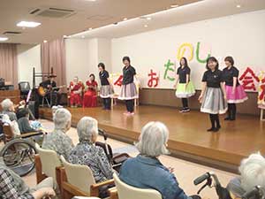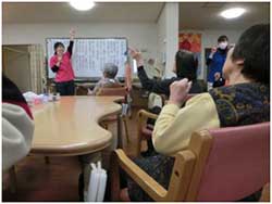 3月8日(日)に蒲郡市民会館にて開催され、昨年同様、けんちんうどんとおにぎりの模擬店の出店をさせていただきます。加えて、今年は大ホールにて行われる『ふれあいカラオケ大会』にも参加することとなりました。演目は美空ひばりさんの『真赤な太陽』。誰もが知っているこの曲に合わせて、カラオケだけでなくダンスの披露も予定しています。はじめは「ステージに上がるなんて緊張しちゃうよ!」「振付を覚えるなんてできるかなあ・・」と弱気な発言も聞かれましたが、最近では毎日のように歌って、踊って、練習に熱が入っています。「ここの振付は覚えたよ。次はどうやるだったっけ」「今日もやるだら?もっと練習しないと。入賞できたらびっくりだね」と、会話も弾んでいます。「衣装はどうする?何かおそろいのものがあるといいねぇ」とのことで、ポンポン作りも行っています。ビニールテープを束にして、細かく裂けば裂くほどふわふわになるため、手作業がお好きな方が中心となって制作してくださっています。 当日はどんな日になるでしょう。練習の成果が発揮でき、充実した日になるようにこれからも取り組んでいきたいと思います。
