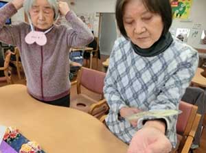 ひな壇にお手玉を投げて乗せるゲーム、筒状にした画用紙をひなあられに見立てて弾いて飛ばすゲーム、輪切りにした牛乳パックをひし餅に見立てて積んでいくゲームなど皆様同席のグループごとに楽しそうに参加されていました。おやつの時間には甘酒をお出しし、「おいしい」と笑顔がたくさん見られました。また、おやつ作りでは桜餅作りを行い、一人一人ご自分でご飯を平らにし、中にあんこを包んで丸め、最後に桜の葉の塩漬けを乗せて作ってくださいました。皆様楽しそうに作っていました。