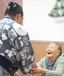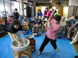 入居者様の方々からは、たくさんの笑顔が見られ、愉しまれている様子でした。なかには、杵を頭上まで振りかぶって搗く方もおり、大変盛り上げて頂き、また普段あまり顔を合わせない方たちとの交流も深まり、とても有意義な時間を過ごして頂けました。
