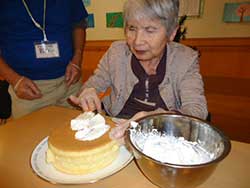 ある入居者様は生地つくりから「カステラなんて作った事ないけどうまくできるかな」と心配されていましたが実際に出来あがったものを食べてみると「甘くておいしい」「ふわふわしてる」と出来栄えに満足されたご様子でした。